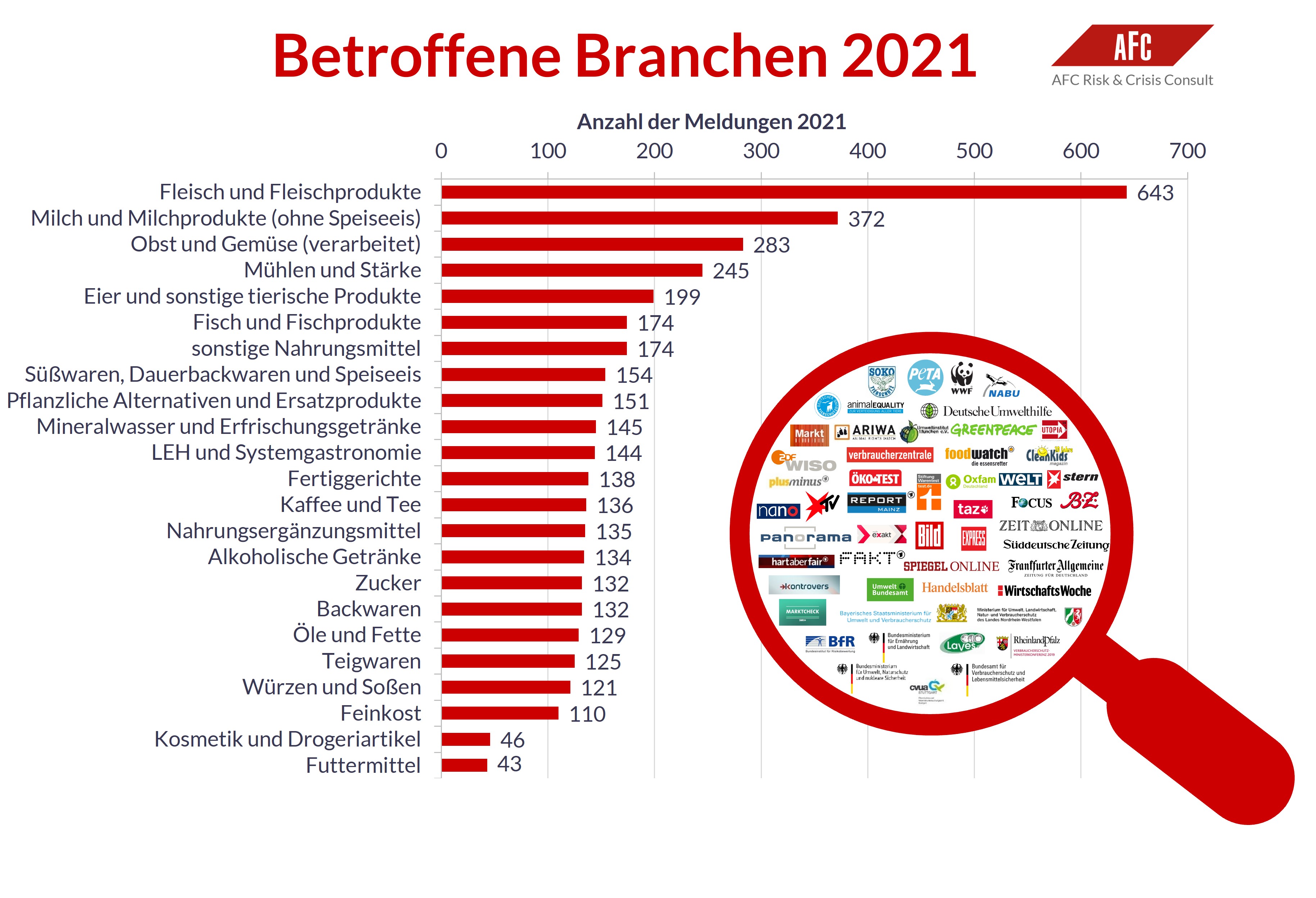 Die Auswertung zeigt auch, welche Branchen in welcher Intensität betroffen waren. Allein auf die Fleischbranche entfielen 643 Meldungen, womit diese die am häufigsten adressierte Branche darstellt. Doch auch die Branchen Milch und Milchprodukte (372), Obst- und Gemüseprodukte (283) sowie Mühlen- und Stärkeprodukte (245) sahen sich vergleichsweise häufig mit Kritik konfrontiert. Von kritischer Berichterstattung betroffen war 2021 jede der Teilbranchen der Agrar- und Ernährungswirtschaft.