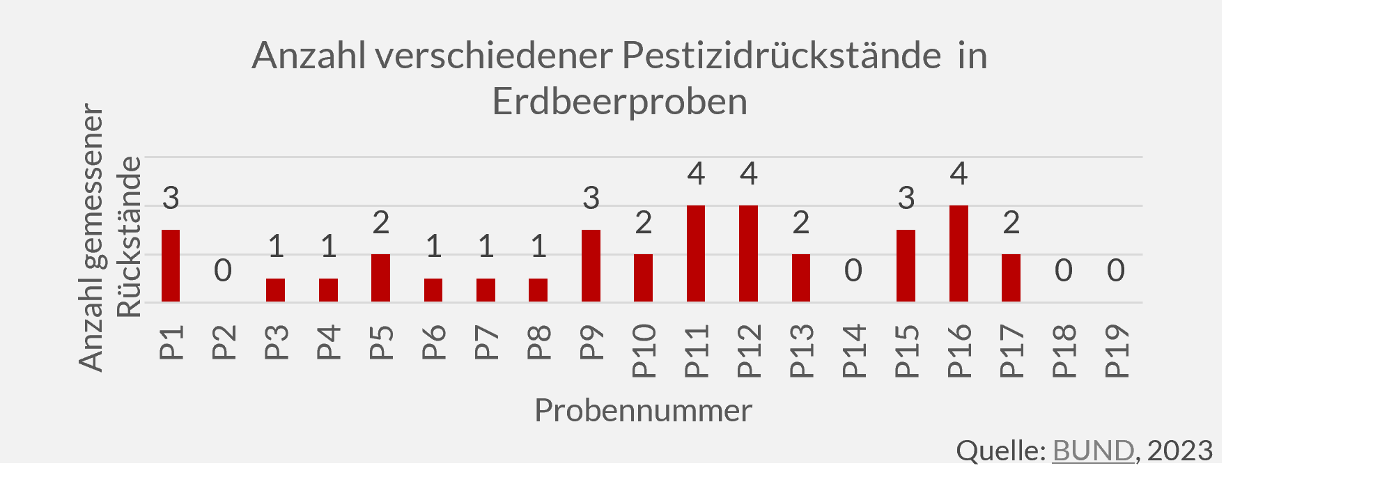 Der Bund für Umwelt und Naturschutz Deutschland (BUND) hat in einer aktuellen Untersuchung Pestizidrückstände auf Erdbeeren unterschiedlicher Lebensmitteleinzelhändler analysieren lassen. Angeblich wiesen 15 der 19 Proben Rückstände von insgesamt acht Fungiziden auf, wobei keine gesetzlich verankerten Grenzwerte für Pestizide überschritten wurden. Allerdings waren in einem großen Teil der untersuchten Proben regelrechte Pestizidcocktails enthalten, deren Wechselwirkungen zu einer Verstärkung der giftigen Wirkung führen und auch Auswirkungen auf das menschliche Hormonsystem haben könnten. Daher fordert die NGO nun mit einer Petition die Halbierung des Pestizideinsatzes in Deutschland bis 2030.