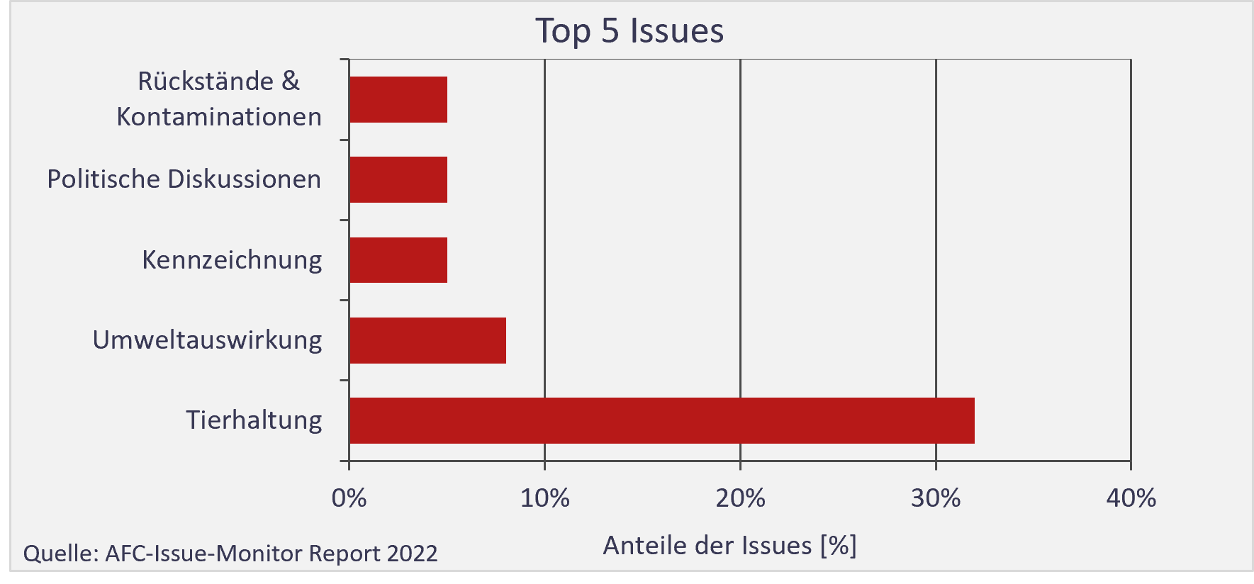 Die Nutztierhaltung steht seit Jahren im Fokus der Öffentlichkeit. Medien und NGOs veröffentlichen fast täglich Beiträge rund um das Thema. Die Tierhaltung belegt mit mehr als einem Drittel aller kritischen Meldungen den Platz 1 der Top-Issues des AFC-Issue-Monitors 2021.