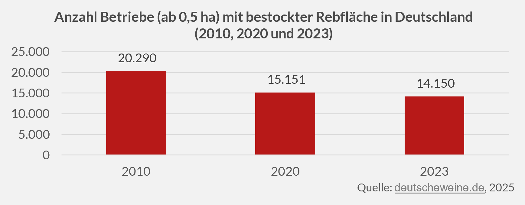 Der Rückgang der Weinproduktion deutscher Winzer war ebenfalls auf klimatische Herausforderungen zurückzuführen: Spätfröste, Starkregen und Hagel führten mancherorts zu Ernteausfällen von bis zu 70 %. Ein feuchtes Frühjahr begünstigte zudem den Befall mit Pilzkrankheiten und Klimaveränderungen förderten die Ausbreitung neuer invasiver Schädlingsarten.