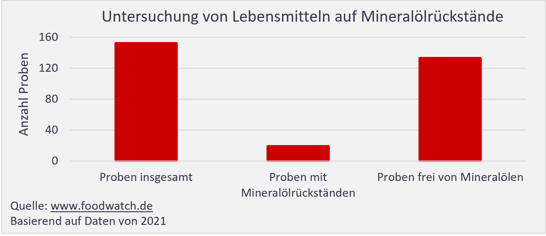 Bereits Ende 2021 habe Foodwatch einige Lebensmittel auf Kontaminationen mit „gefährlichen“ Mineralölen untersucht. Dabei seien von 125 Produkten 19 Produkte (12,5 %) mit Mineralrückständen belastet gewesen. Die kürzlich festgelegte Obergrenze für Mineralöle in Lebensmitteln sei laut Foodwatch ein erster Schritt hin zu mehr Lebensmittelsicherheit. Die NGO stellt dennoch weiterhin die Forderung nach einer konsequenten Nulltoleranz für krebsverdächtige Mineralöle an den Bundesernährungsminister. Die Nulltoleranz solle Lebensmittelfirmen dabei unterstützen ihre Produkte frei von Mineralölen halten zu können.