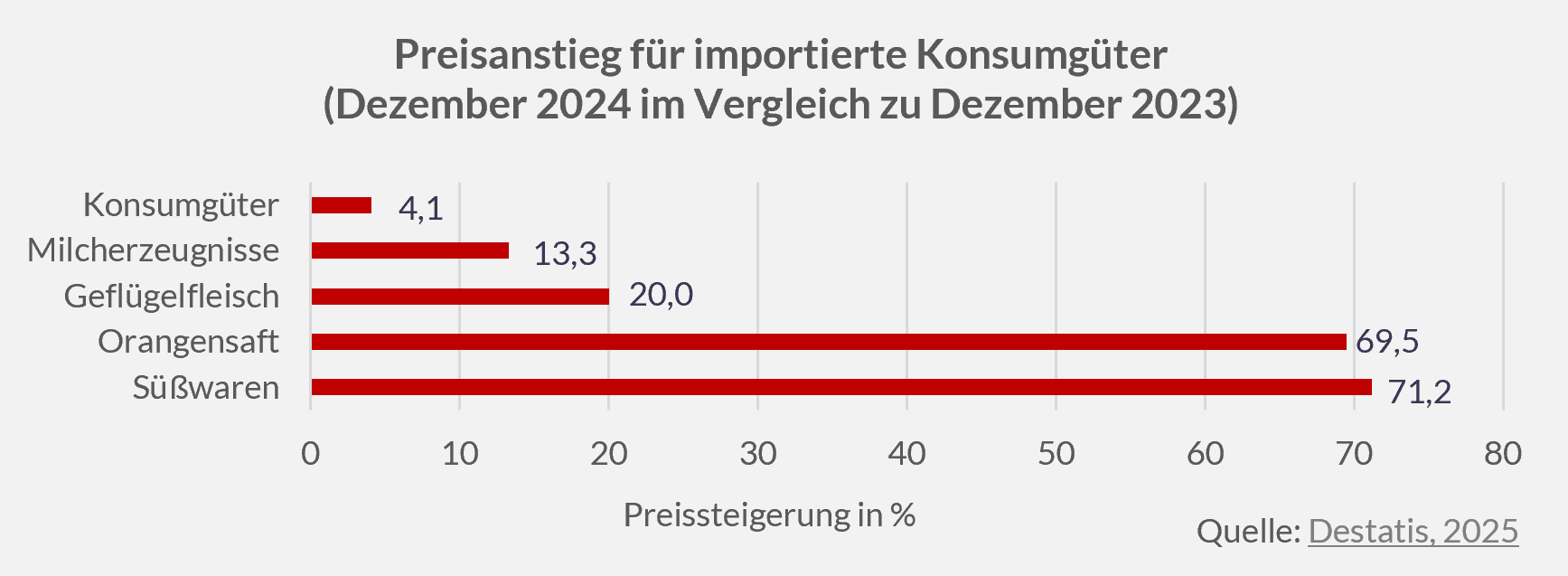 Ein Grund für den Anstieg der Importpreise sind gestiegene Rohstoffkosten. Für Lebensmittelhersteller bedeutet das sowohl höhere Produktionskosten als auch engere Margen. Besonders deutlich ist der Preisanstieg bei Schokolade. Unternehmen sehen sich gezwungen, die Verkaufspreise ihrer Produkte entsprechend anzupassen, um gestiegene Produktionskosten zu decken. Neben den Rohstoffkosten tragen aber auch globale Lieferkettenprobleme zur Preiserhöhung bei.