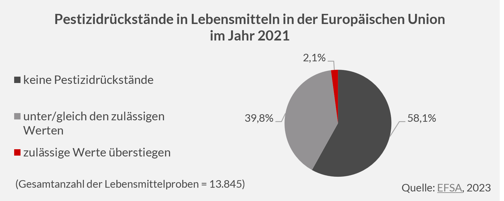 Die Europäische Behörde für Lebensmittelsicherheit (EFSA) kommt zu der Einschätzung, dass von Pestizidrückständen in Lebensmitteln wahrscheinlich keine Gefahr für Verbraucher:innen ausgeht. Diese Einordnung basiere auf Ergebnissen des EU-koordinierten Kontrollprogramms (EU MACP), in dessen Rahmen pflanzliche und tierische Lebensmittel europaweit auf Pestizidrückstände untersucht werden.
