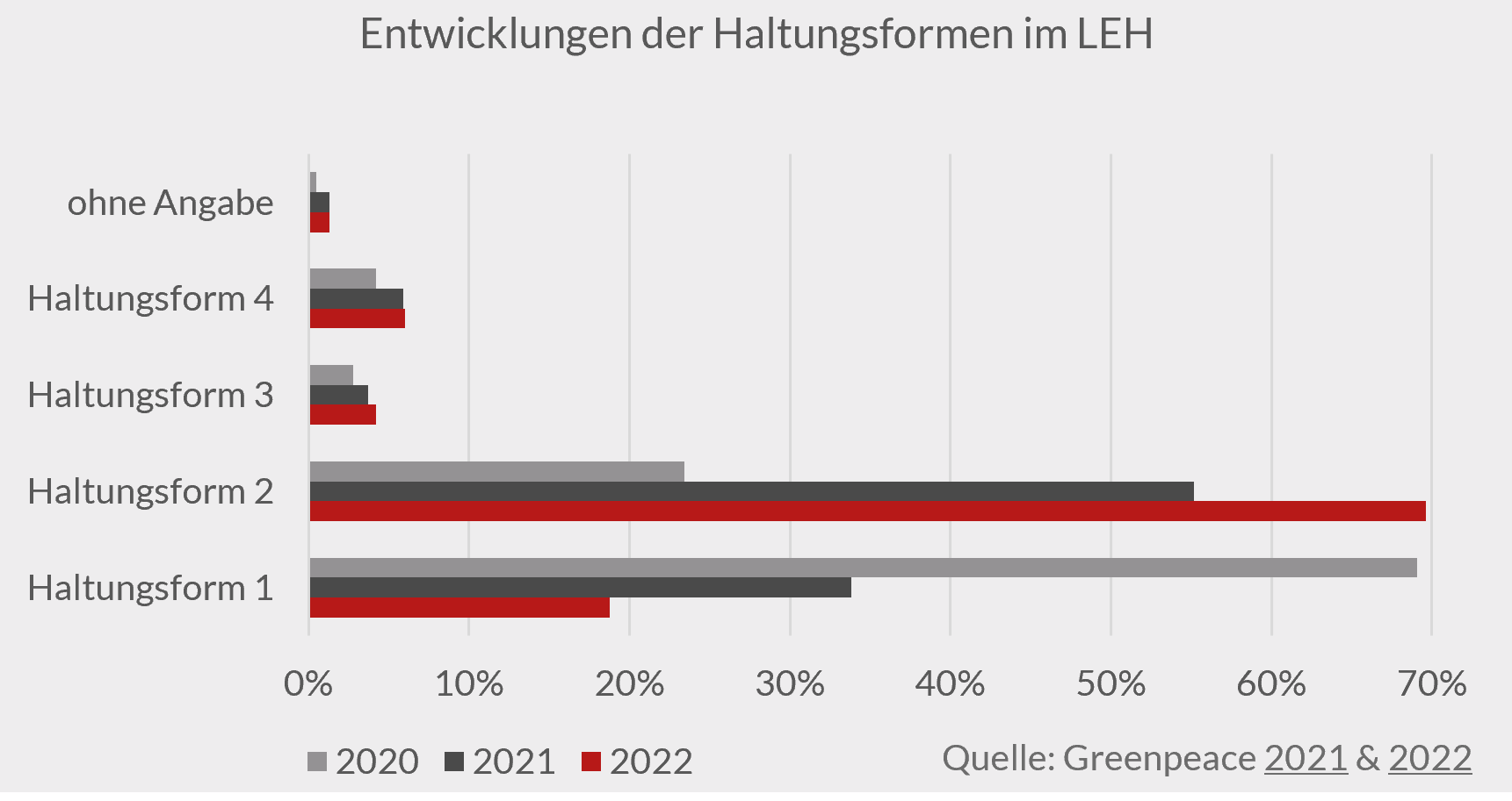 Eine Greenpeace-Erhebung aus dem letzten Jahr zeigt, dass bereits einige Lebensmitteleinzelhändler die Verfügbarkeit höherer Haltungsformen im Stufenmodell umsetzen.