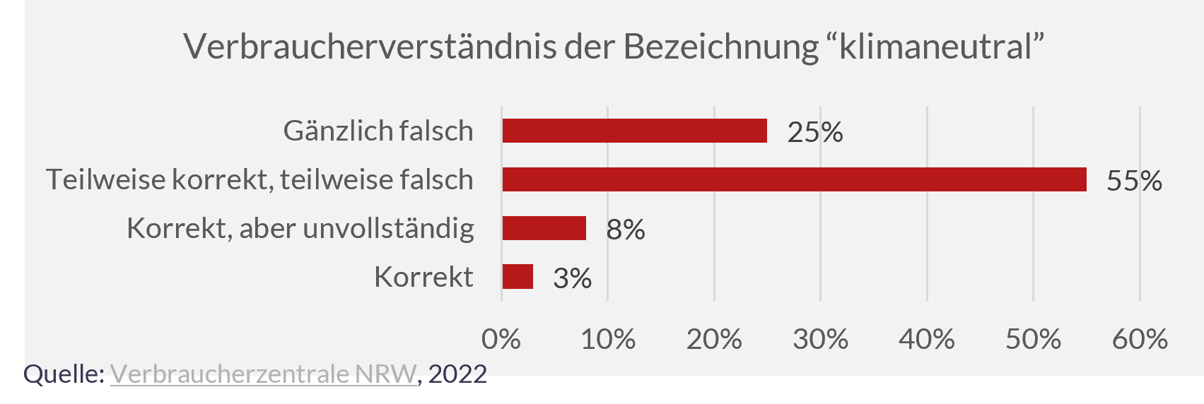 Eine Studie der Verbraucherzentrale legt offen, dass Verbraucher:innen häufig die Möglichkeit fehlt, sich umfassend über Labels und Claims zur Klimaneutralität zu informieren. So wissen nur 3% der Verbraucher:innen im Detail, was „klimaneutral“ überhaupt bedeutet.