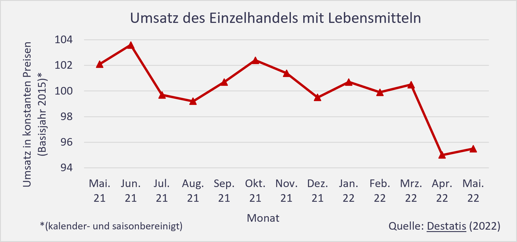 Bereits im April 2022 kam es zum bisher größten Umsatzeinbruch im Lebensmitteleinzelhandel seit Beginn der Datenerhebung 1994 (Destatis).