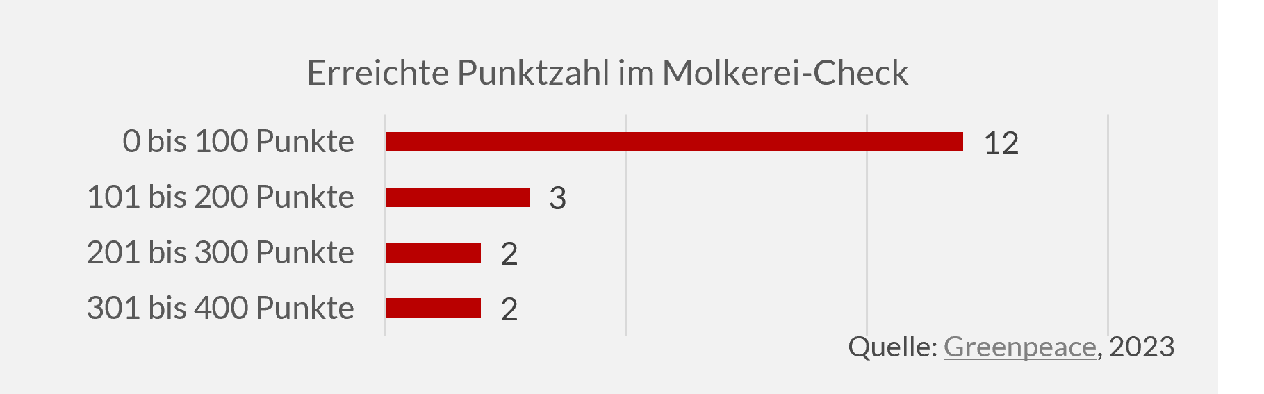 Im aktuellen Molkerei-Check von Greenpeace werden zwölf deutsche Molkereien auf Grund fehlender Transparenz und unzureichender Tierhaltungsstandards negativ bewertet. Grundlage für diese Bewertung von 0 (sehr schlecht) bis 400 (sehr gut) bilden laut Greenpeace vorliegende Informationen zu Haltungsbedingungen von Milchkühen führender deutscher Molkereien. Nach Aussage des frei zugänglichen Berichtes stünden die meisten Kühe das ganze Jahr im Stall, wobei rund zehn Prozent in Anbindehaltung über Monate fixiert würden.