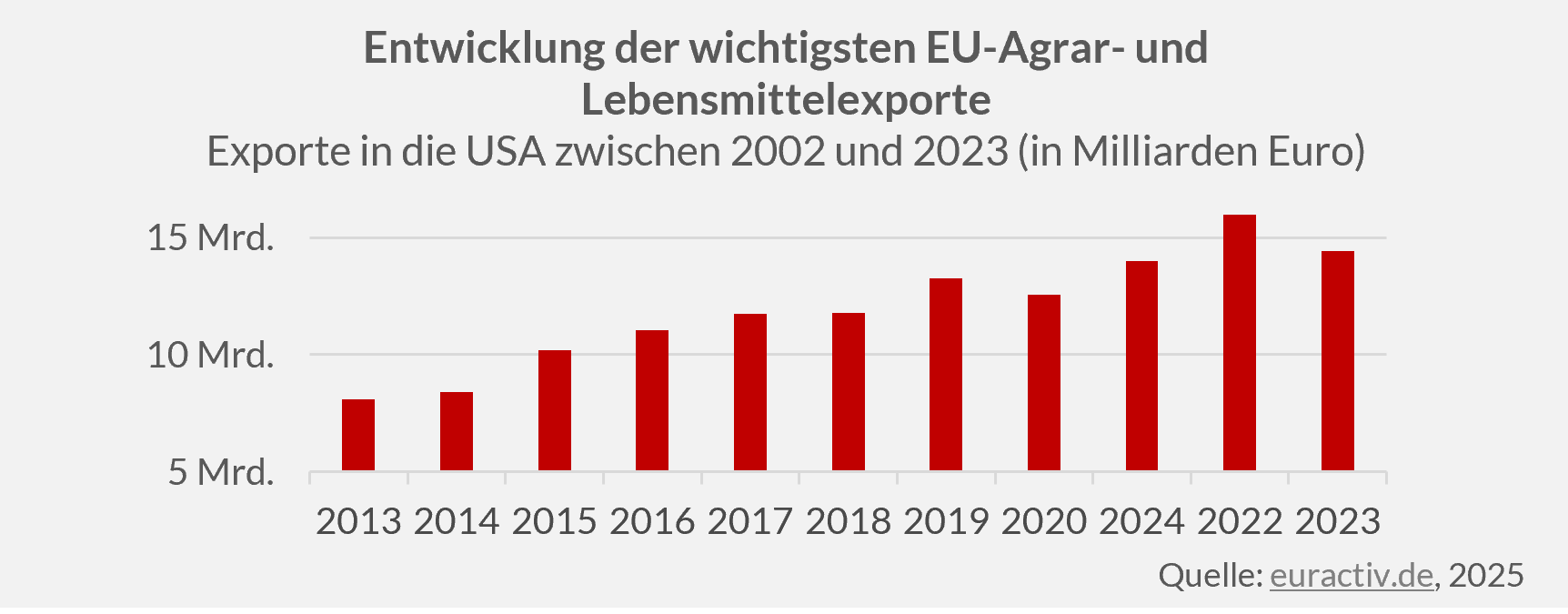Kritiker hingegen warnen vor hohen Kosten für internationale Produzenten und einem sinkenden Absatz europäischer Waren in die USA. Zwar ist der Exportanteil von Agrargütern in die USA relativ gering, sodass die direkten Auswirkungen der US-Zölle auf die EU-Ernährungsindustrie begrenzt bleiben dürften. Doch auch weitere Zollentscheidungen, wie etwa die US-Importzölle auf Waren aus Kanada und Mexiko, werden die Branche weiterhin beschäftigen.