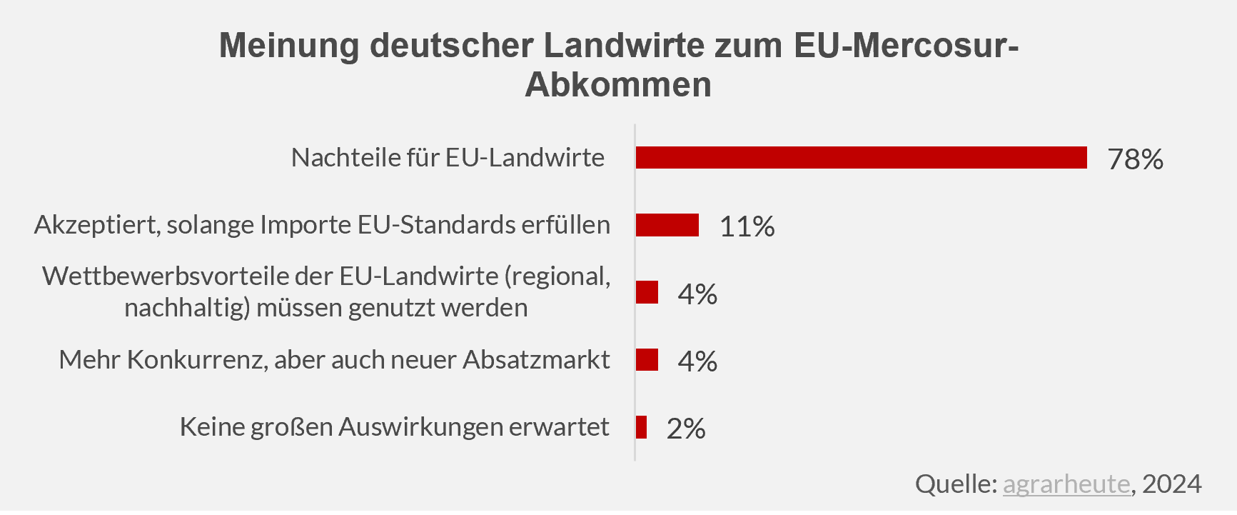 Das Mercosur-Abkommen könnte den Wettbewerb durch günstige Agrarimporte aus Südamerika verschärfen. Insbesondere fürchtet Polen durch den Abschluss des Abkommens seine führende Position als größter Geflügelexporteur der EU einzubüßen. Auch Bauernverbände und Landwirte in anderen EU-Staaten stehen dem Abkommen kritisch gegenüber. Dies zeigte sich unter anderem in einer Umfrage unter Landwirten in Deutschland.