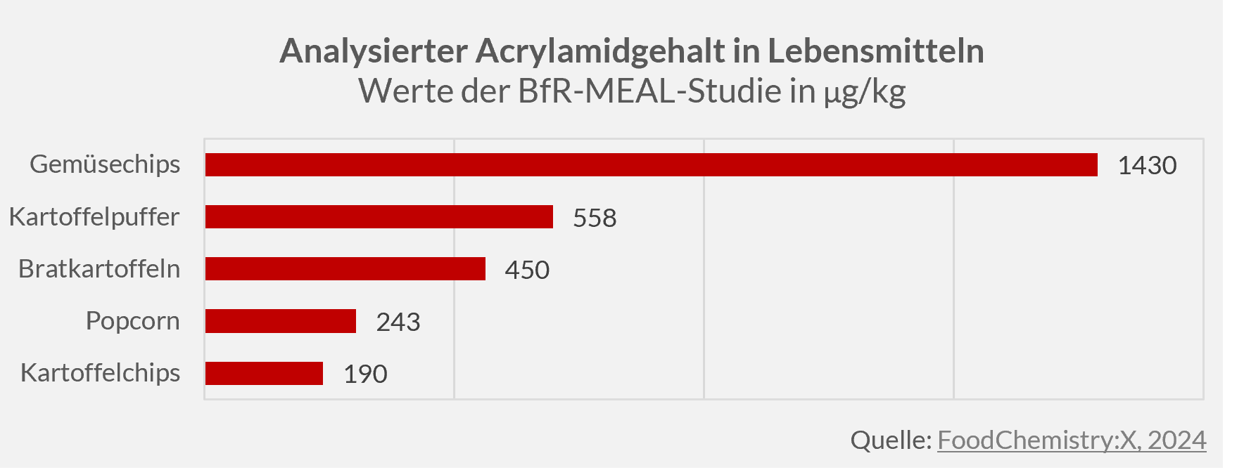 Ein zentrales Ergebnis der Studie ist der hohe Acrylamidgehalt bestimmter Lebensmittel, die im Rahmen der Studie getestet wurden. Auffällig sind hohe Werte in Gemüsechips, die bis zu siebenmal höher sind als in herkömmlichen Kartoffelchips. Dahinter reihen sich Kartoffelpuffer und Bratkartoffeln ein. Acrylamid entsteht bei der Verarbeitung stärkehaltiger Lebensmittel. Da es als potenziell krebserregend gilt und keine sichere Verzehrsmenge festgelegt ist, wird empfohlen, die Aufnahme so gering wie möglich zu halten. Die Daten der aktuellen Studie untermauern die frühere Empfehlung des BfR, Nahrungsmittel nur leicht zu bräunen, statt kräftig anzubraten.