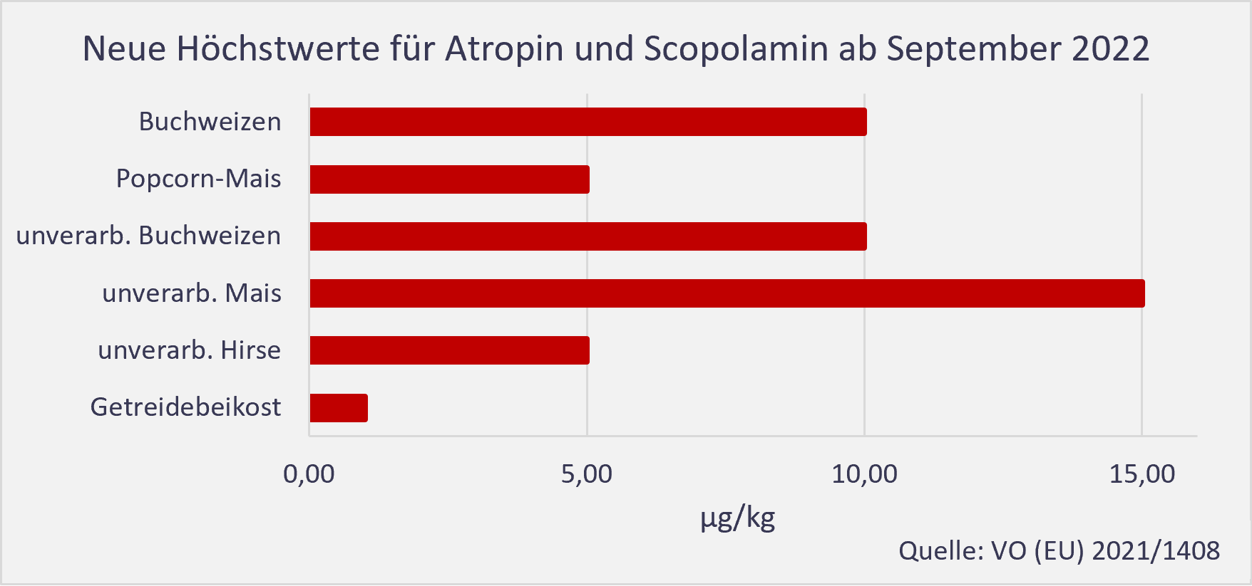 Bis 2021 gab es nur Grenzwerte für TAs in Getreidebeikost für Babys von 1µg/kg, die in der Verordnung (EG) Nr. 1881/2006 geregelt waren. Besonders Babys und Kleinkinder sind am meisten durch TAs gefährdet, so die Untersuchungen. Die Verordnung (EU) 2021/1408 regelt ab Ende August 2022 außerdem die Höchstgehalte in den Warengruppen Hirse, Mais, Buchweizen und Kräutertee.