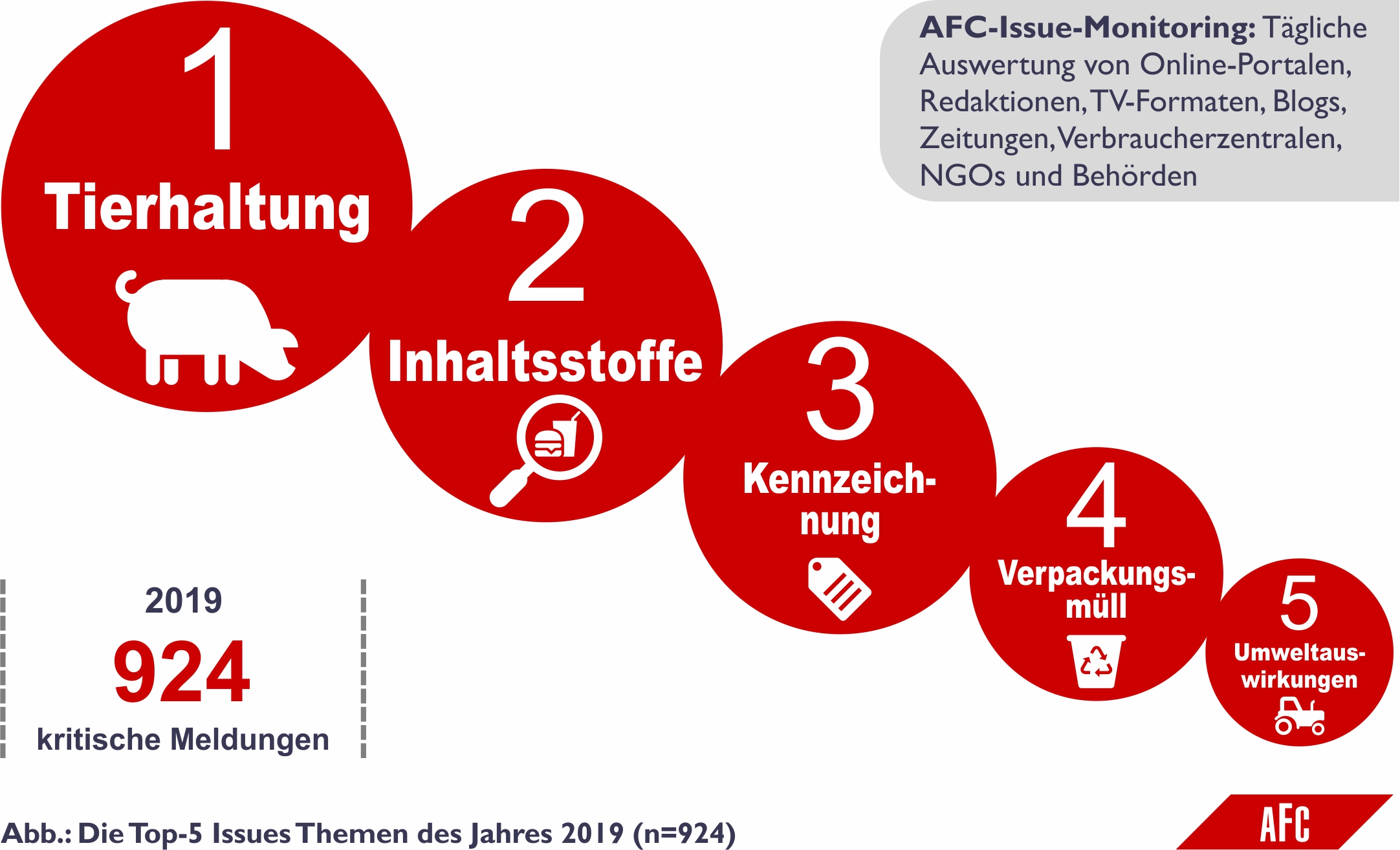 Die Analyse „AFC-Issue-Monitor Report 2020“ basiert auf der Auswertung von 924 Veröffentlichungen, die im Rahmen des AFC-Issue-Monitorings identifiziert und als kritisch eingestuft wurden. Das Issue-Monitoring dient zur Risikofrühwarnung für die Agrar- und Ernährungsbranche, indem laufend Online-Medien, Fernsehsendungen, NGOs und Behörden auf für die Branche kritische Meldungen beobachtet und bewertet werden. Die Auswertung gibt damit umfassend Auskunft über die Issues der Agrar- und Ernährungsbranche sowie deren Trends.